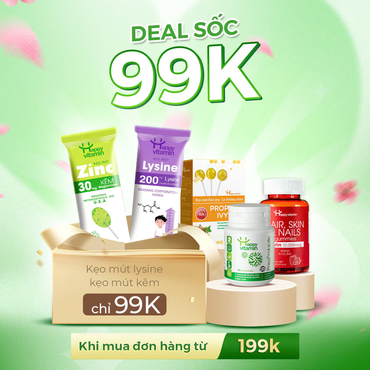 DEAL SỐC 99K cho sản phẩm kẹo mút bổ sung Kẽm và kẹo mút bổ sung Lysine khi mua đơn hàng từ 199K.
