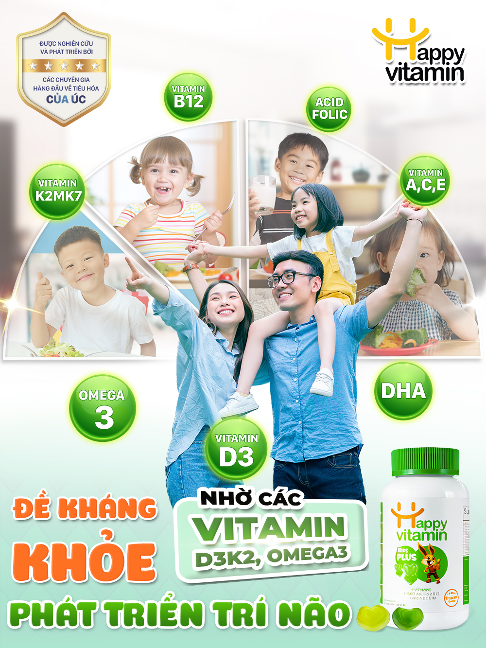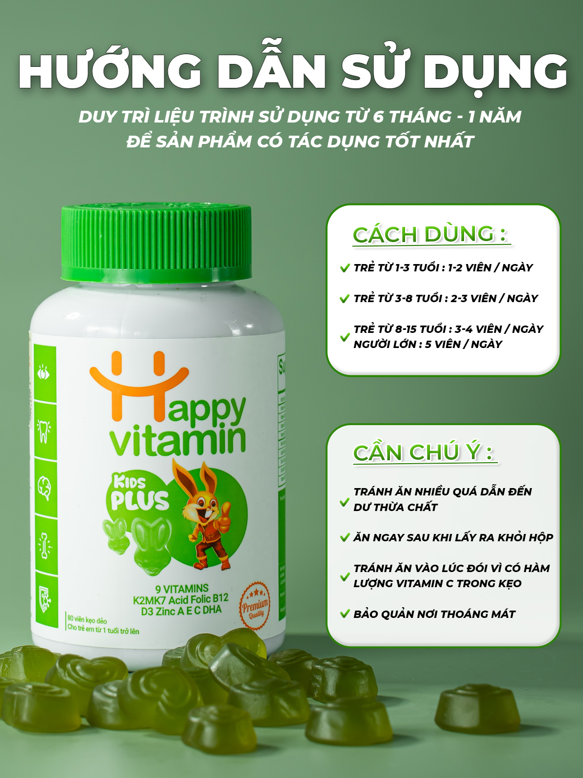 Happy Vitamin Kids Plus+ là kẹo dẻo bổ sung Vitamin tổng hợp cho bé theo Công nghệ độc quyền từ ÚC. Với sản phẩm này, quý phụ huynh có thể an tâm khi bé được bổ sung các hàm lượng vitamin cao trong cơ thể.