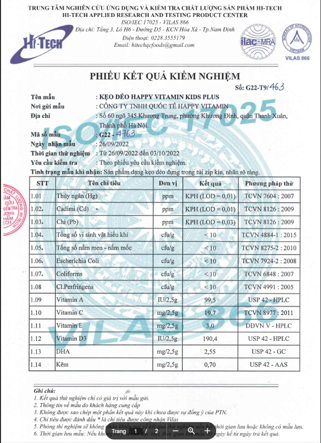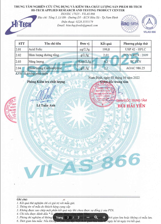 Sản phẩm đã được kiểm định thành phần An toàn Vệ sinh Thực Phẩm