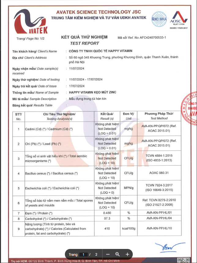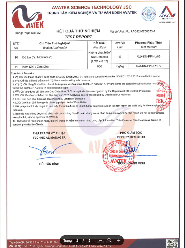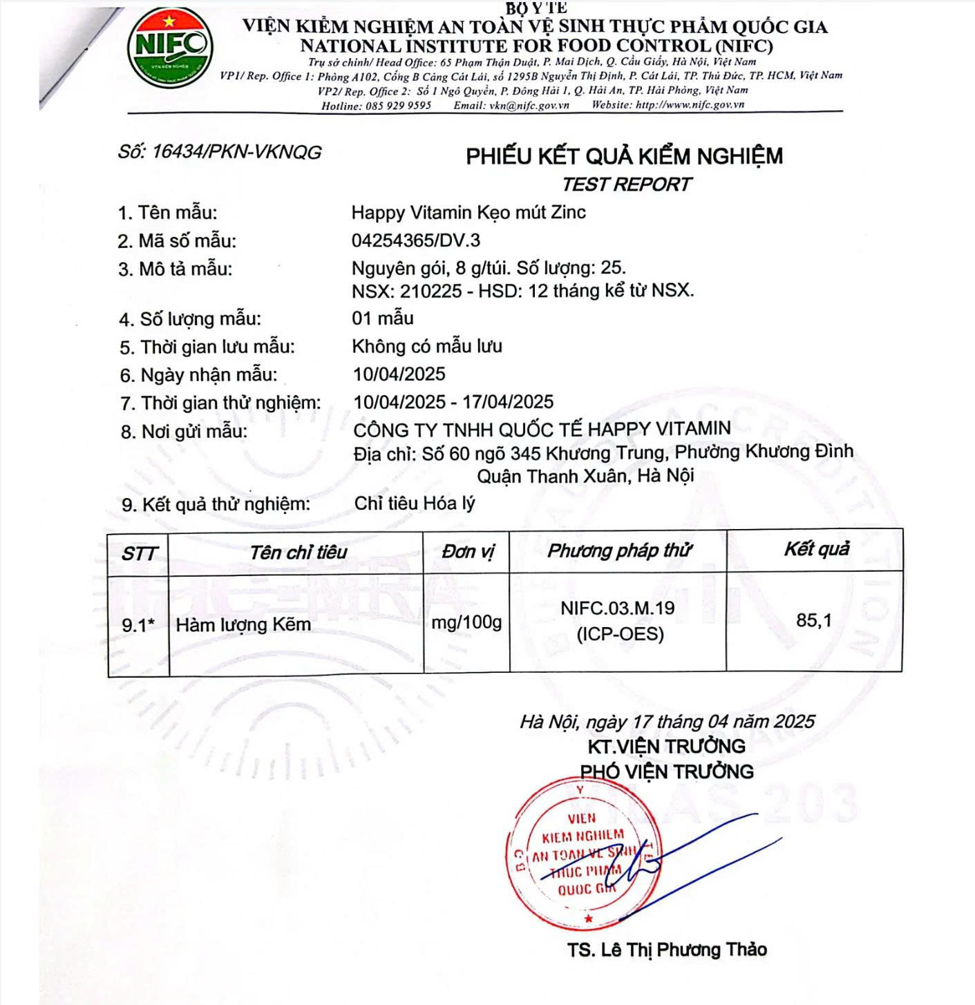 Sản phẩm được kiểm nghiệm bởi VIỆN KIỂM NGHIỆM AN TOÀN VỆ SINH THỰC PHẨM QUỐC GIA về hàm lượng kẽm từ ngày 10/04/2025