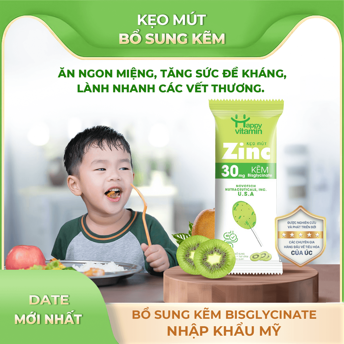 Kẹo mút bổ sung lysine của thương hiệu Happy Vitamin là sự lựa chọn hoàn hảo dành cho bé yêu của bạn. Với công thức đặc biệt chứa Kẽm sinh học Zinc bisglycinate nhập khẩu Mỹ giúp hấp thu tốt hơn 43% so với kẽm gluconate do được liên kết với hai phân tử glycine (axit amin). , sản phẩm không chỉ giúp con ăn ngon miệng, tăng đề kháng mà còn mang đến hương vị kiwi thơm ngon, hấp dẫn.