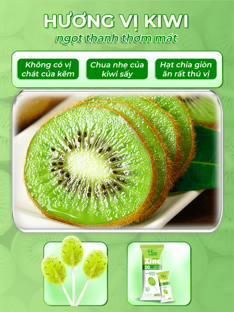 Kẹo mút bổ sung kẽm Happy Vitamin không chỉ là món ăn vặt ngon miệng mà còn là nguồn dinh dưỡng quý giá cho bé yêu. Với hàm lượng kẽm cao, hương vị kiwi và hạt chia thơm ngon và thành phần dinh dưỡng phong phú, sản phẩm là sự lựa chọn lý tưởng giúp bé phát triển khỏe mạnh và toàn diện. Hãy bổ sung kẹo mút kẽm Happy Vitamin vào chế độ dinh dưỡng hàng ngày của bé để cảm nhận sự khác biệt!