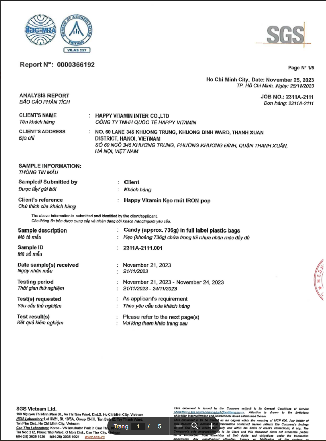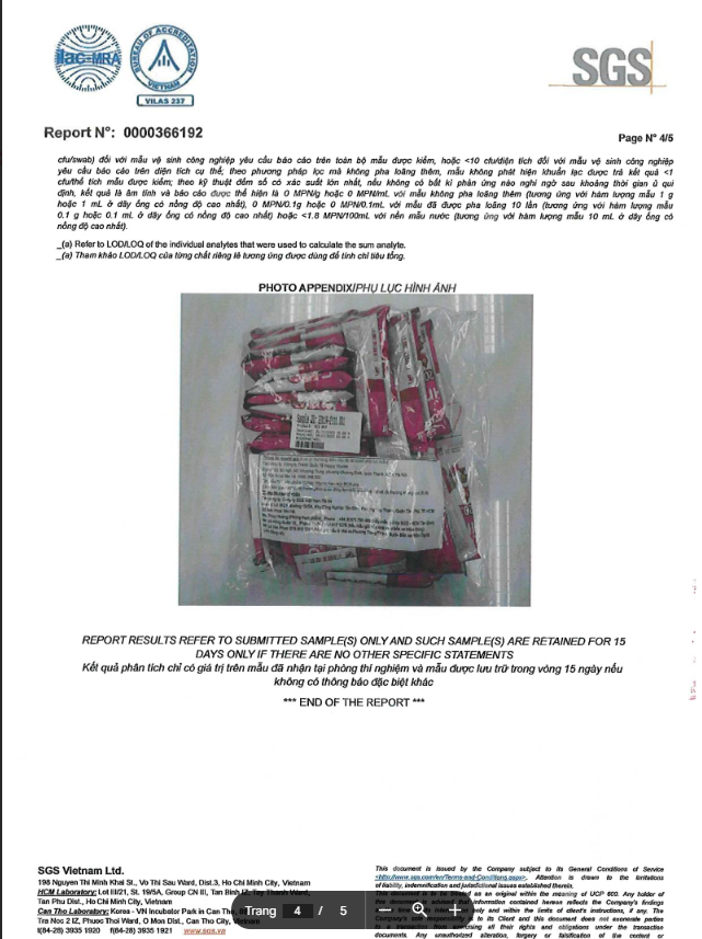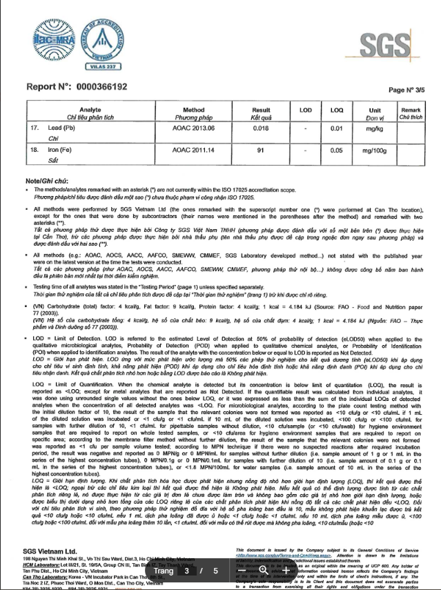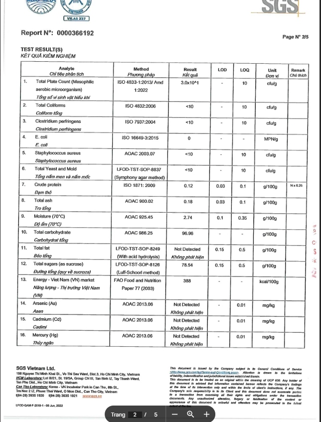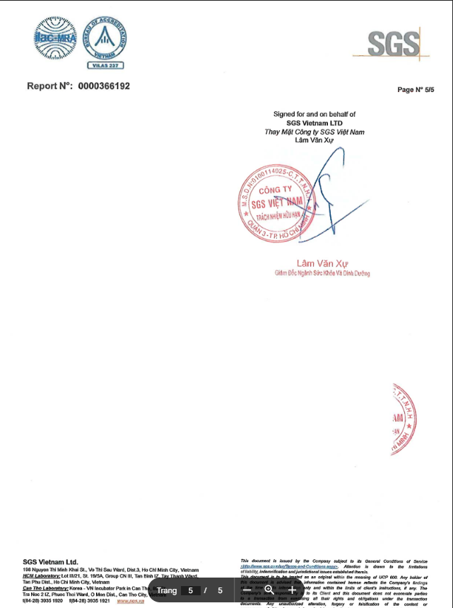 Đã được kiểm định thành phần An toàn Vệ sinh Thực Phẩm theo tiêu chuẩn Quốc Tế SGS