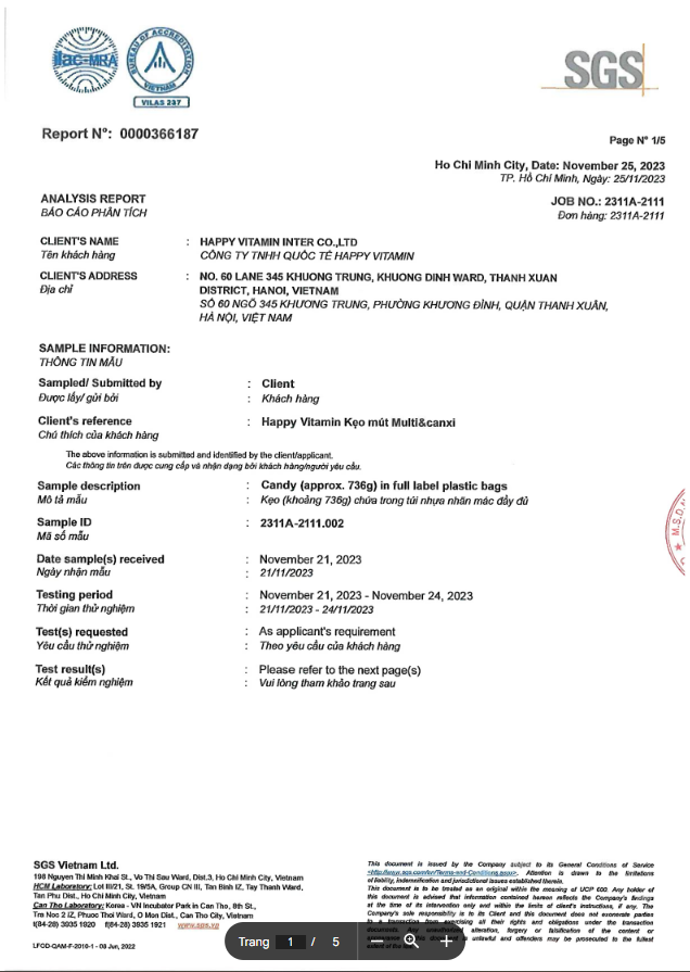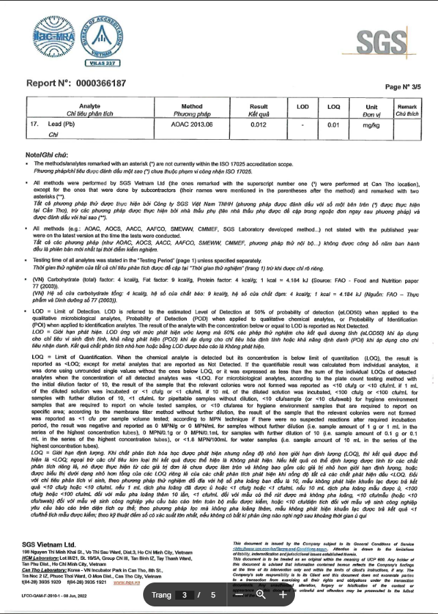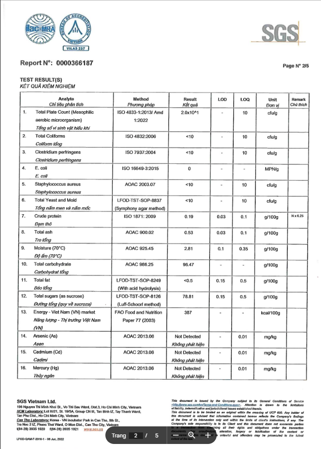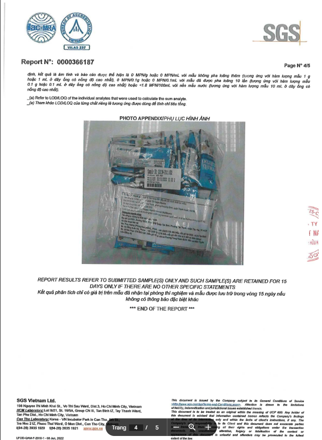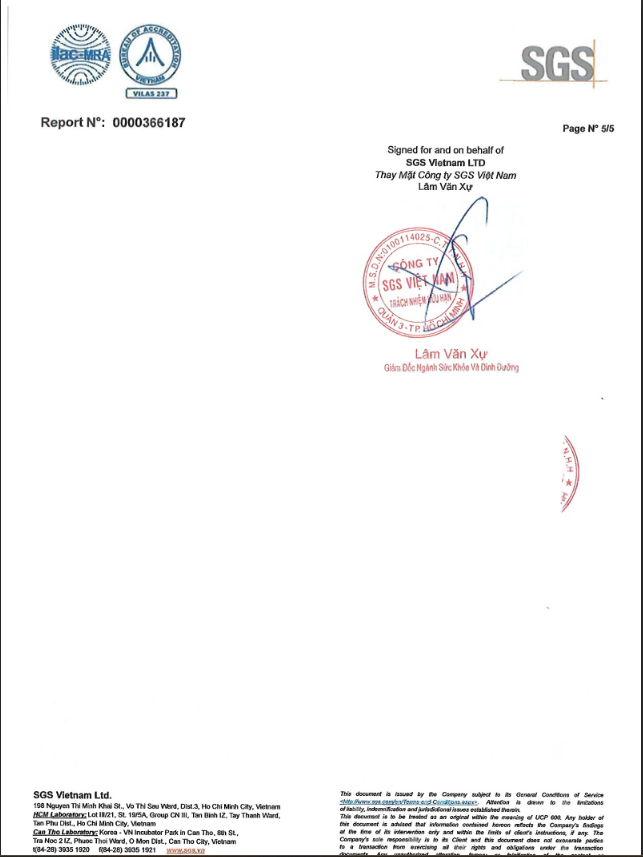 Sản phẩm đã được kiểm định thành phần An toàn Vệ sinh Thực Phẩm theo tiêu chuẩn Quốc Tế SGS