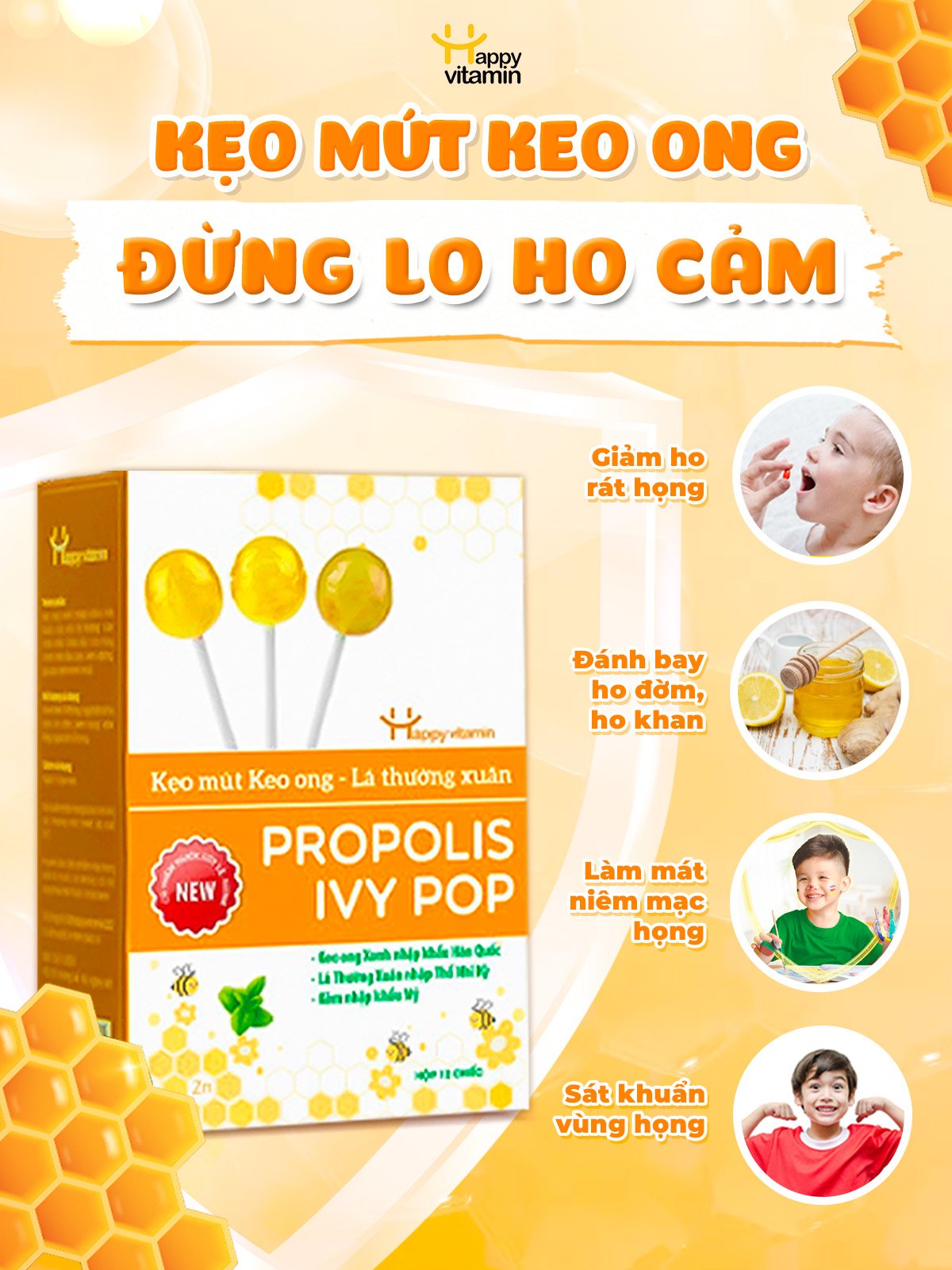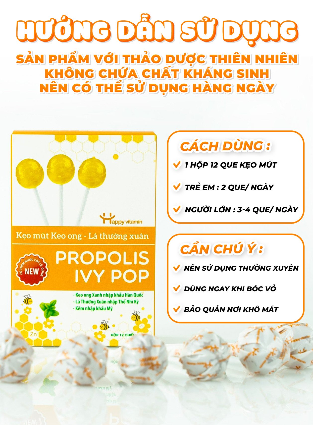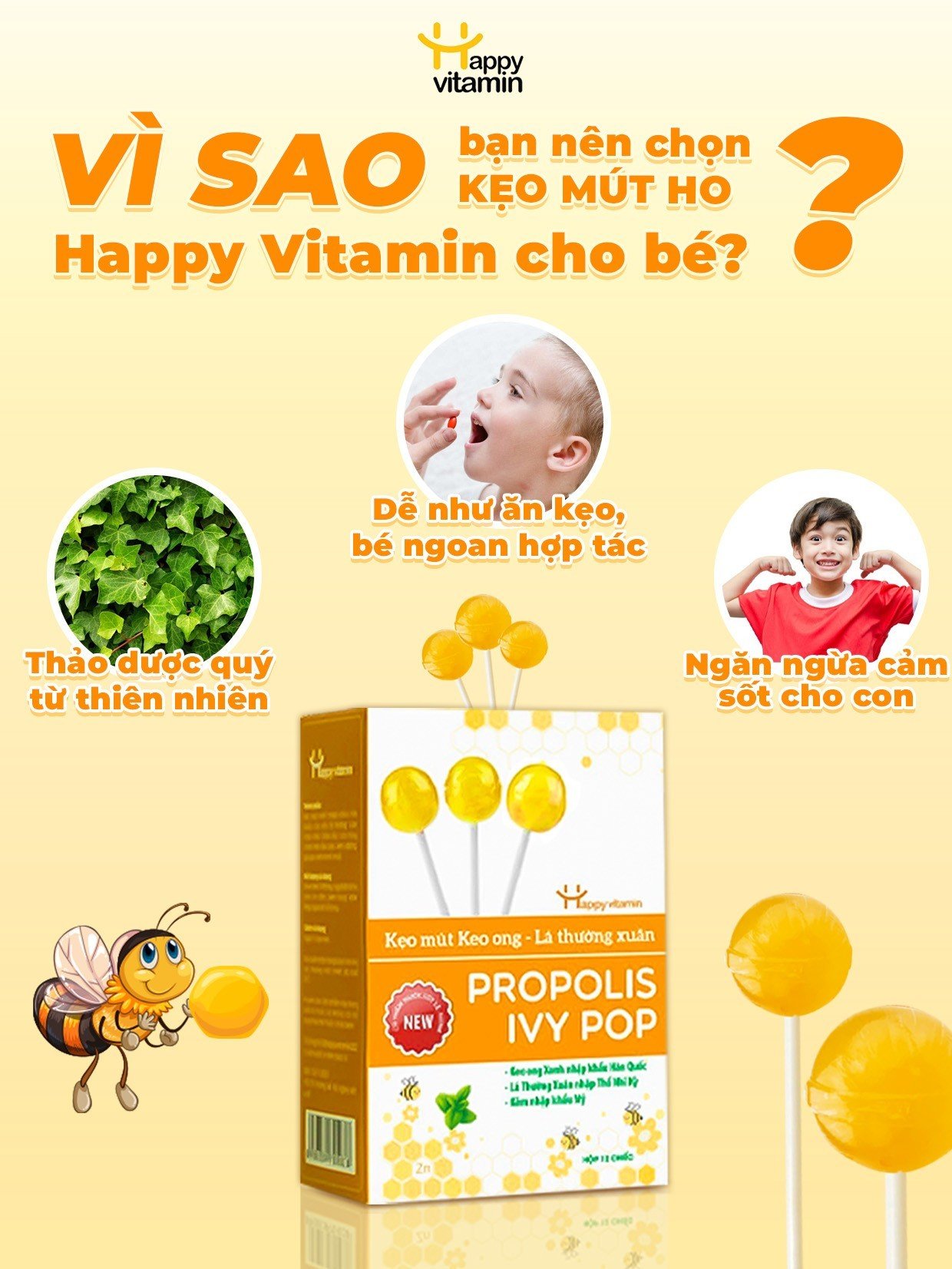 Đồng hành cùng cha mẹ trong việc chăm sóc trẻ nhỏ, chúng tôi hoàn toàn thấu hiểu và cảm thông những trăn trở của các bậc phụ huynh. Chính vì thế, chúng tôi đã cho ra đời dòng sản phẩm kẹo mút keo ong- lá thường xuân. Kẹo mút là một trong những loại kẹo luôn được trẻ con yêu thích. Chính vì lẽ đó mà chúng tôi tin rằng, dòng sản phẩm của chúng tôi có thể hỗ trợ các phụ huynh trong việc giảm ho hiệu quả cho trẻ. Giúp trẻ có thể hấp thu tốt các vitamin cần thiết mà không có bất kỳ việc chống đối hay trốn tránh nào.