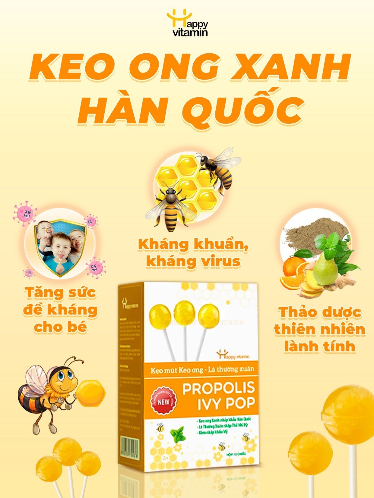 Kẹo mút keo ong- lá thường xuân có chứa nhiều các loại vitamin và thành phần có lợi cho hệ hô hấp của trẻ. Việc kết hợp keo ong xanh Hàn Quốc, cao khô lá thường xuân từ Thổ Nhĩ Kỳ cùng với Cao húng chanh và kẽm Gluconate được nhập khẩu từ Mỹ, Tinh dầu cam, đường glucose, acid citric đã tạo ra một sản phẩm hoàn thiện.